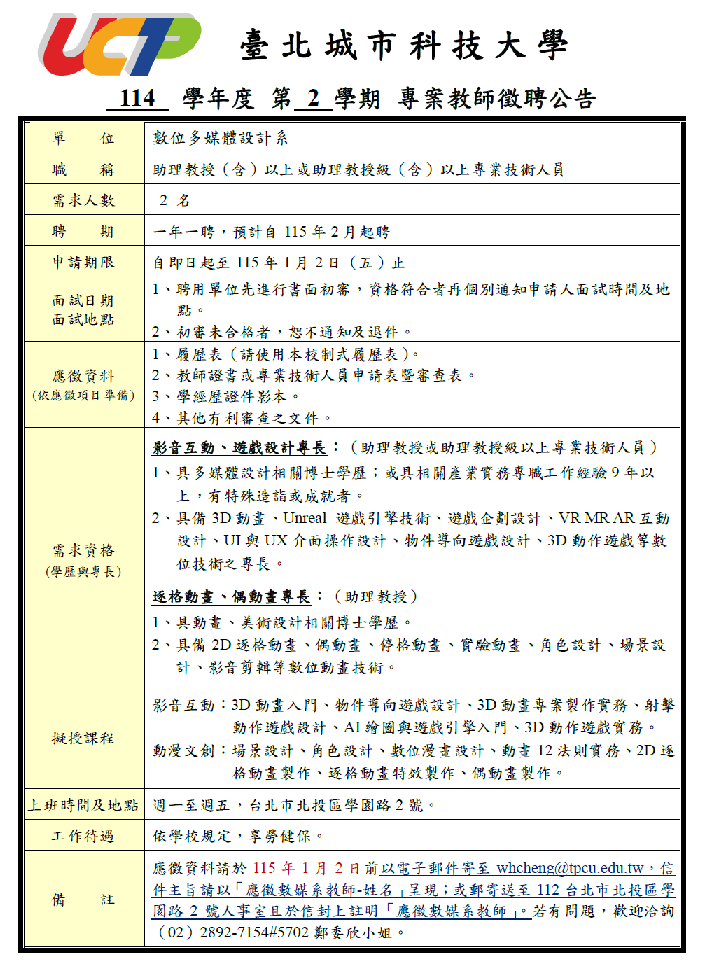 徵聘【數位多媒體設計系】助理教授(含)以上或助理教授級(含)以上專業技術人員之專案教師2名(截止日期:115/1/2)