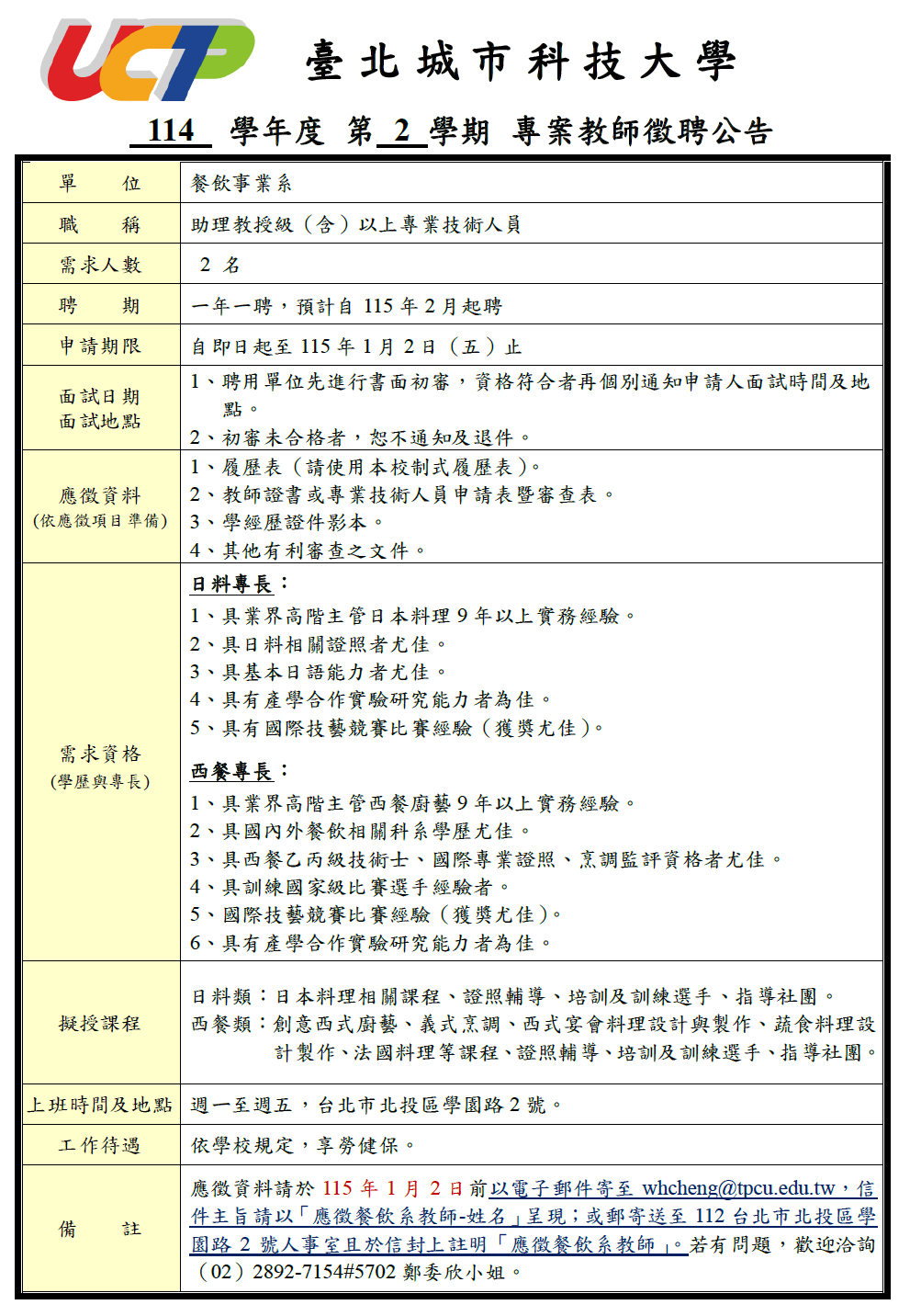 徵聘【餐飲事業系】助理教授級(含)以上專業技術人員之專案教師2名(截止日期:115/1/2)