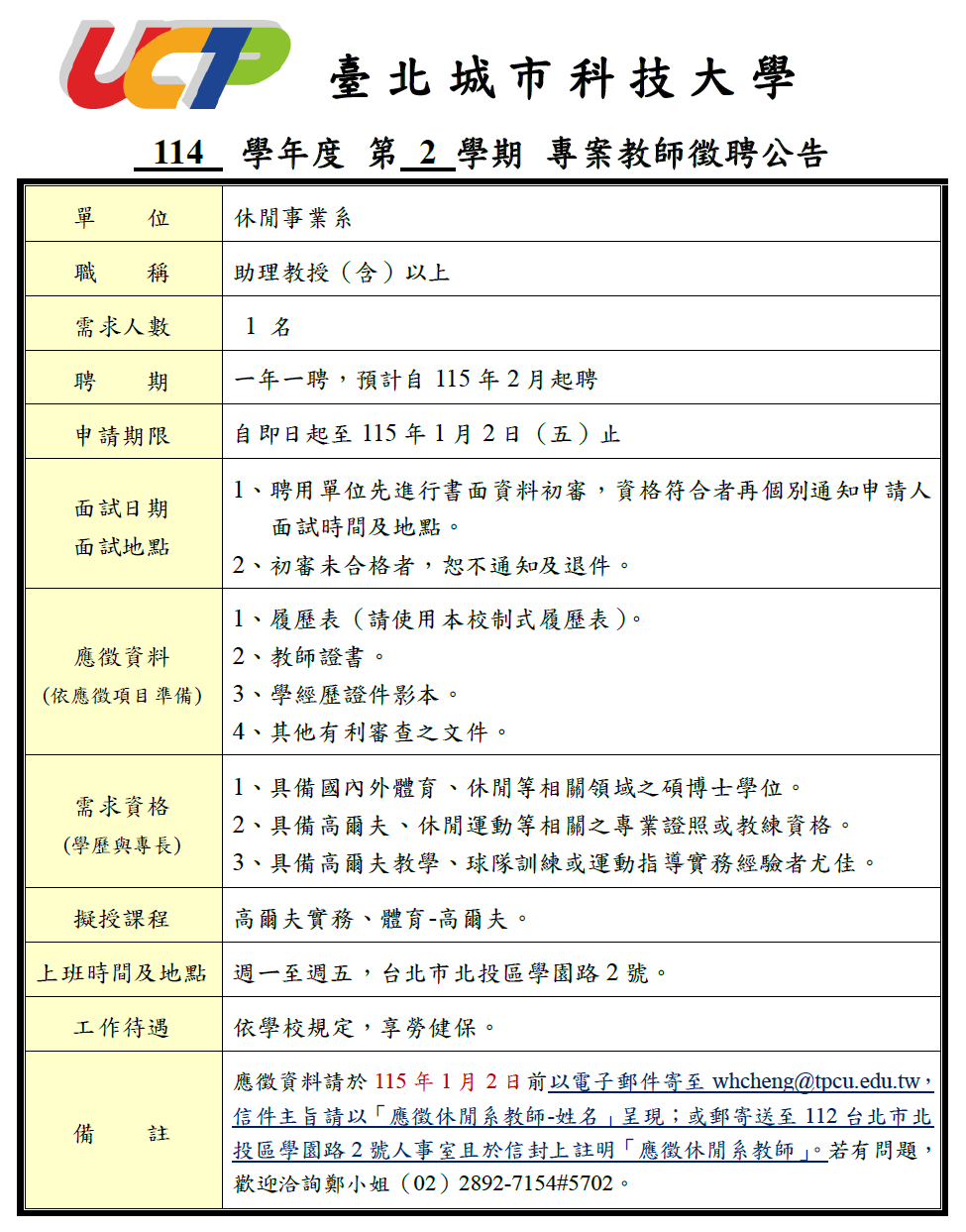 徵聘【休閒事業系】助理教授(含)以上專案教師1名(截止日期:115/1/2)