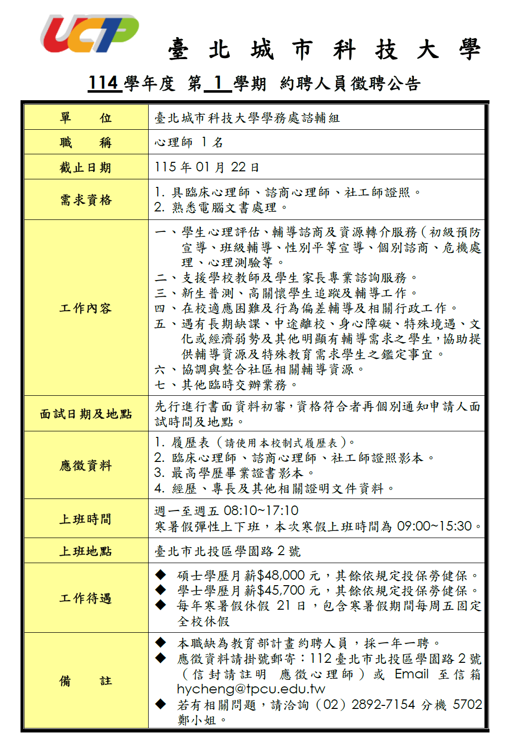 徵聘本校心理師 1名(公告至115/01/22)