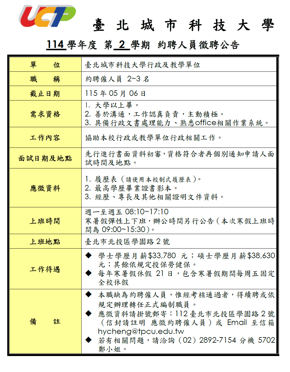 徵聘本校約聘僱人員 數名(公告至115/05/06)